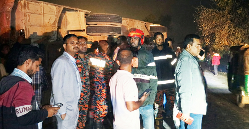 A pedestrian was killed and at least 25 passengers were injured after a passenger bus overturned in Bahubal upazila. The accident occurred around 7:00 PM on Friday in the Dubai Bazar area of Putijuri Union.
